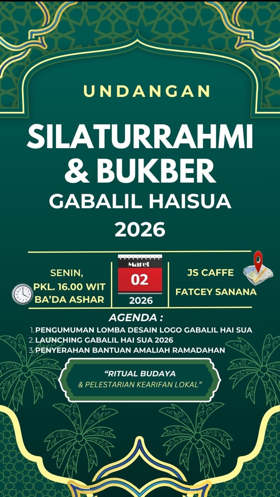 Panitia Gabalil Haisua resmi Lounching Sua Wel Bihu (Sula Pangge Pulang, red) yang ditandai pengumuman pemenang Sayembara Logo, Buka Puasa Bersama dan pembagian 100 paket Ramadhan 1447 Hijriah kepada yang berhak. Tiga kegiatan Pra-Gabalil Haisua ini dilaksanakan di JSCoffee, bilangan Fatce Sanana, Senin (2/3). Tradisi Gabalil Hai Sua sudah tercatat sebagai Kekayaan Intelektual Komunal (KIK) di Direktorat Jenderal Kekayaan Intelektual (DJKI) Kementerian Hukum (Kemenkum) Republik Indonesia.