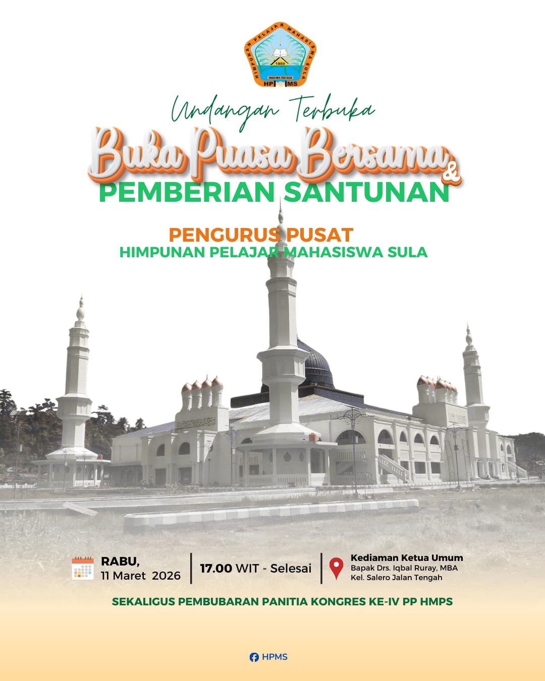 Doa, Buka Puasa Bersama, dan Berbagi ini, lanjut Dr. Upi, diiinisiasi langsung oleh Ketum PP HPMS, Bapak Haji Iqbal Ruray yang dirangkaikan dengan pembagian total 150 paket bantuan dan santunan untuk anak yatim, termasuk warga Sula.