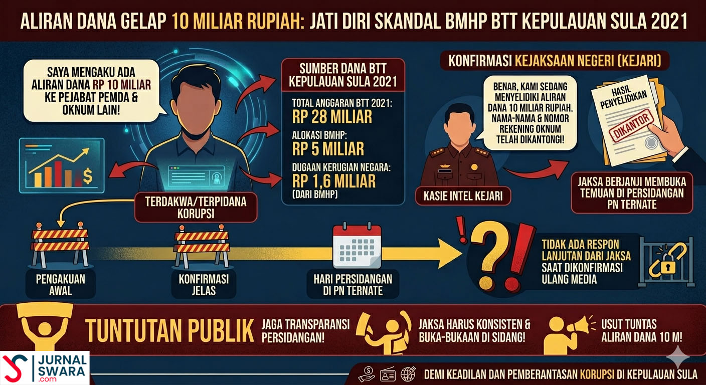 JScom | Kepulauan Sula – Informasi aliran uang ini memang membingungkan. Karena nilai item BMHP yang berperkara korupsi ini cuman 5 miliar rupiah. Tapi begitulah fakta penyidikan yang diungkap Kasie Intel Kejaksaan Negeri Kepulauan Sula, Fauzan Iqbal, kepada wartawan, Kamis (19/02/2026) lalu.